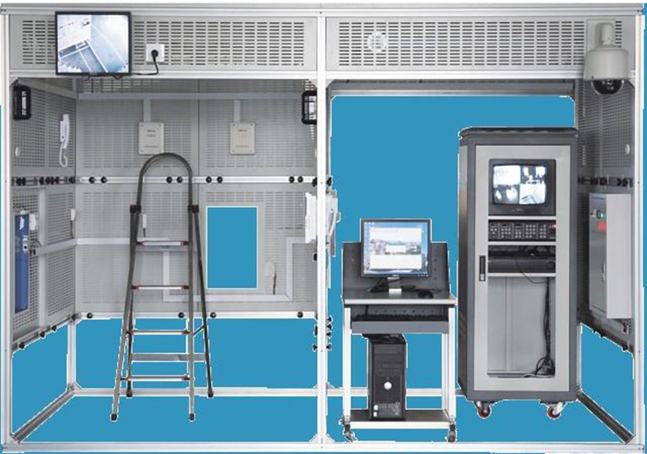 建筑模型由標準規格的鋁合金工業型材和網孔式安裝板組成,設有總電源箱。建筑模型分為智能大樓(小區)和管理中心兩部分,安保區域設有單元門和單戶窗,實現智能小區對講門禁系統的設備安裝、智能大樓室內安防系統的設備安裝等工程訓練,實現單元和單戶可視對講功能。